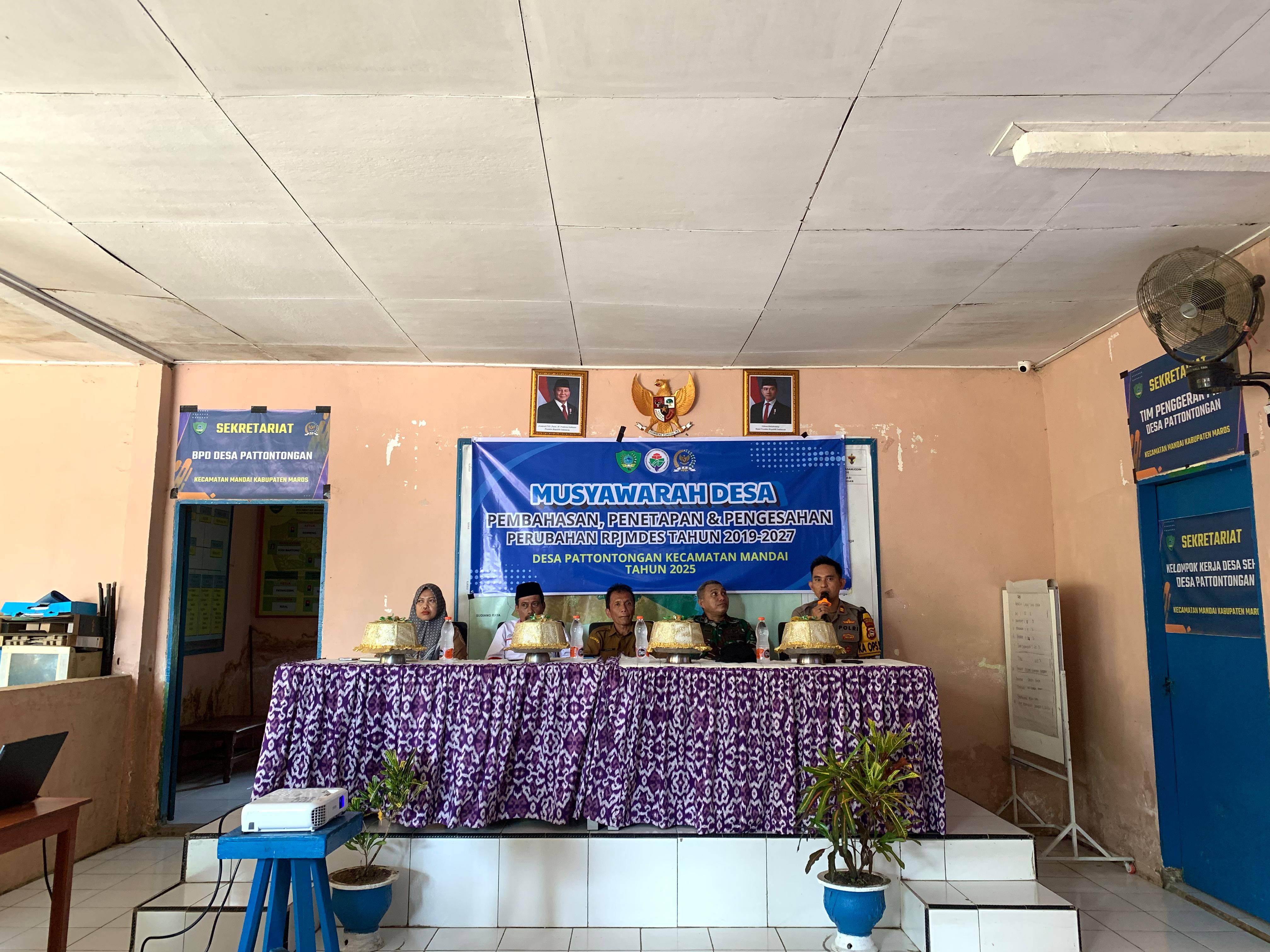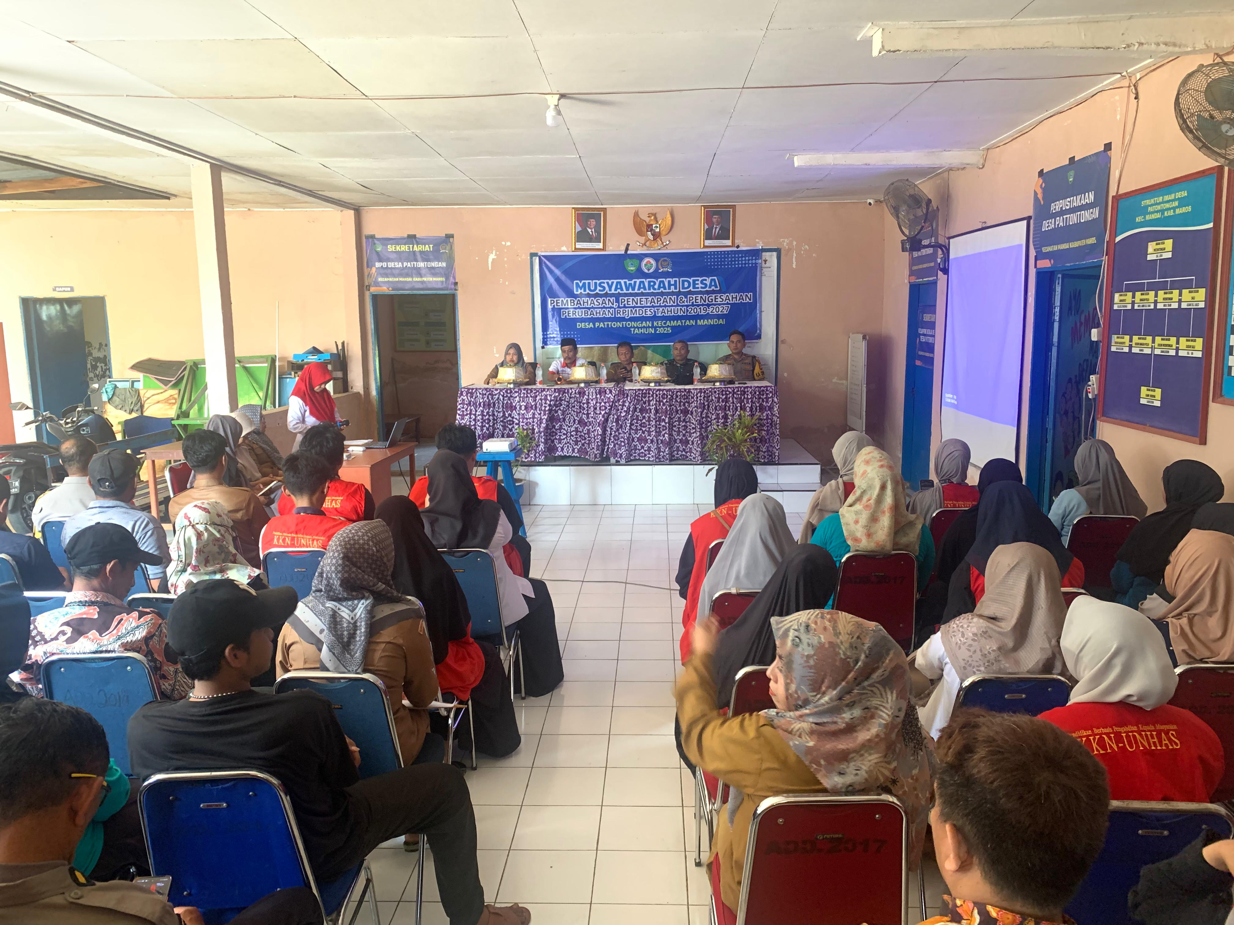Musyawarah Desa Pattontongang Penetapan dan Pengesahan Perubahan RPJMDes 2019-2027 Pada tanggal 21 Juli 2025, bertempat di Desa Pattontongang, Kecamatan Mandai, Kabupaten Maros, yang dihadiri oleh Sekretaris Camat Mandai, Bapak Danramil Kecamatan Mandai, Bapak Kapolsek Kecamatan Mandai, Pendamping Kecamatan, Pendamping Lokal Desa, Mahasiswa KKNT Unhas Beserta Unsur Masyarakat Lainnya yang membahas Tentang Penetapan dan Pengesahan Perubahan Rencana Pembangunan Jangka Menengah Desa (RPJMDes) periode 2019-2027. Musyawarah ini merupakan tahapan penting dalam proses penyesuaian perencanaan pembangunan desa agar tetap relevan dengan dinamika dan kebutuhan masyarakat. Perubahan RPJMDes menjadi krusial mengingat adanya berbagai faktor internal dan eksternal yang dapat mempengaruhi arah pembangunan desa. Faktor-faktor tersebut antara lain perubahan kebijakan pemerintah di tingkat atas, perkembangan kondisi sosial dan ekonomi masyarakat, serta potensi dan tantangan baru yang muncul di Desa Pattontongang. Melalui musyawarah ini, diharapkan tercipta sinkronisasi dan harmonisasi antara perencanaan pembangunan desa dengan kondisi riil di lapangan. Musyawarah desa ini dihadiri oleh berbagai unsur masyarakat, termasuk perangkat desa, tokoh masyarakat, perwakilan kelompok perempuan, pemuda, dan unsur lainnya. Partisipasi aktif seluruh elemen masyarakat dalam musyawarah ini menjadi cerminan komitmen bersama dalam membangun Desa Pattontongang yang lebih baik. Hasil dari musyawarah ini adalah kesepakatan bersama mengenai perubahan RPJMDes 2019-2027. Penetapan dan pengesahan perubahan RPJMDes ini akan menjadi pedoman bagi pemerintah desa dan masyarakat dalam melaksanakan pembangunan desa di masa mendatang. Diharapkan, dengan adanya perubahan RPJMDes yang telah disepakati bersama ini, pelaksanaan pembangunan di Desa Pattontongang dapat berjalan lebih efektif, efisien, dan tepat sasaran, serta memberikan manfaat yang sebesar-besarnya bagi seluruh masyarakat. Penulis: Sukmawati